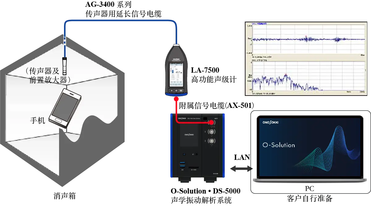 ● 在使用LA-7500精密声级计实时确认智能手机/手机的来电铃声音压级的同时, 将声级计的AC输出信号输入到DS-5000 O-Solution倍频程分析套件,通过FFT频率分析、1/1和1/3倍频程分析以及指定频带的趋势分析,来求取其声学特性。