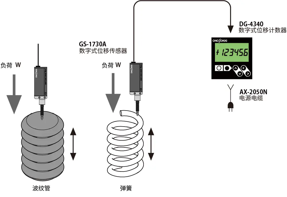 ●将主轴放置在波纹管或弹簧上,在该位置重置归零,测量施加一定量的负荷时的压缩位移量(负荷-位移测量)。