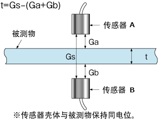 将被测物插入传感器A与B之间,分别测量传感器与被测物的间隙(Ga、Gb),由此计算厚度(t)。