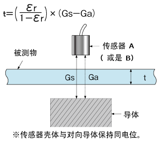 当在传感器与导体(基准床)之间插入被测物时,传感器的输出为Ga,并根据该输出变化量及材料的相对介电常数 εr 来计算厚度(t)。
