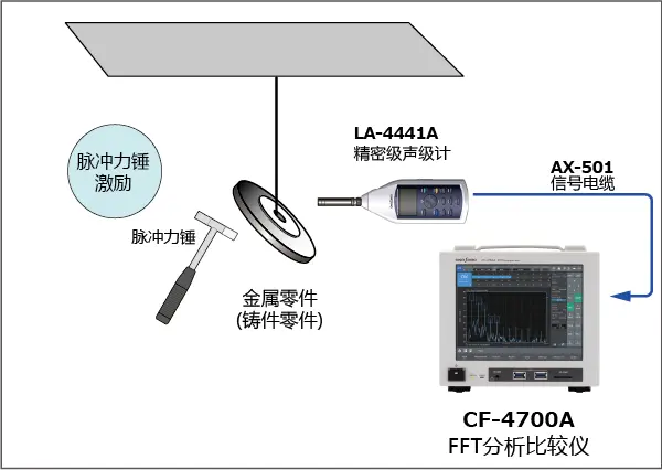 打击金属零件时,如果金属零件存在破裂以及裂缝时,打击音的频率会与正常状态下有所变化。因此,可把金属零件悬吊起来处于自由振动状态下,通过打击加振的进行音检查。LA-4441A 精密级声级计用于脉冲力锤打击时的声音测量,从声级计AC输出端子输出信号到 CF-4700A FFT分析比较仪,进行频率分析。从良品及不良的波谱形状,进行和否判定。