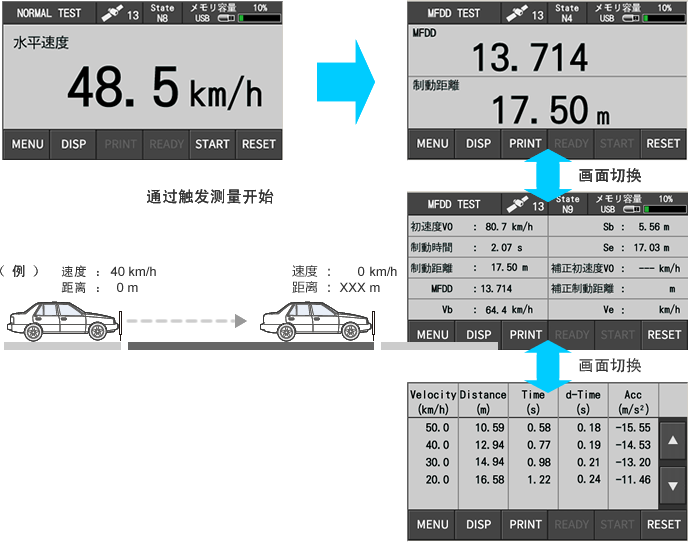 ・测量车辆由规定速度(初速度)状态全力制动车辆达到车辆停止时的所用时间,移动距离,制动初速度。
