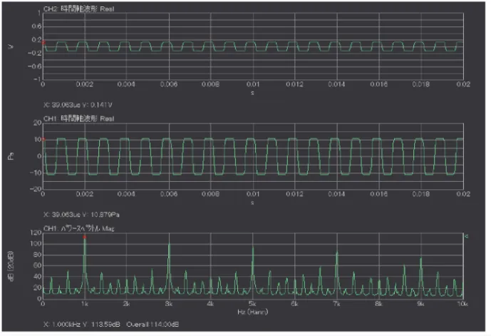 When the voltage range of DS-3000 is 100 mVrms, the calibration signals are shown in Figure 4. The voltage waveform (upper) and the sound pressure waveform (middle) don’t have clear peak and they are not sin-waves. In addition, there are peaks other than 1 kHz, and these are not normal signals when looking at the power spectrum.