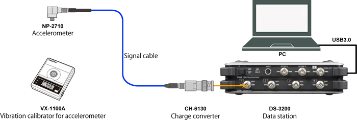The charge output type accelerometer cannot be directly connected to the DS-3000 Data station or CF-9000 FFT Analyzer. It is necessary to connect the products such as CH-1200A Charge amplifier and CH-6130 / 6140 Charge converter between them and convert the charge signal output from the accelerometer into the voltage signal.