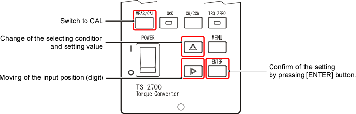 2. Turn the [POWER] switch ON while pressing two keys of [ENTER] and [MEAS/CAL] at the same time. The TS-2700 is started with the setting of [MENU] and zero adjustment value at the time of shipment.