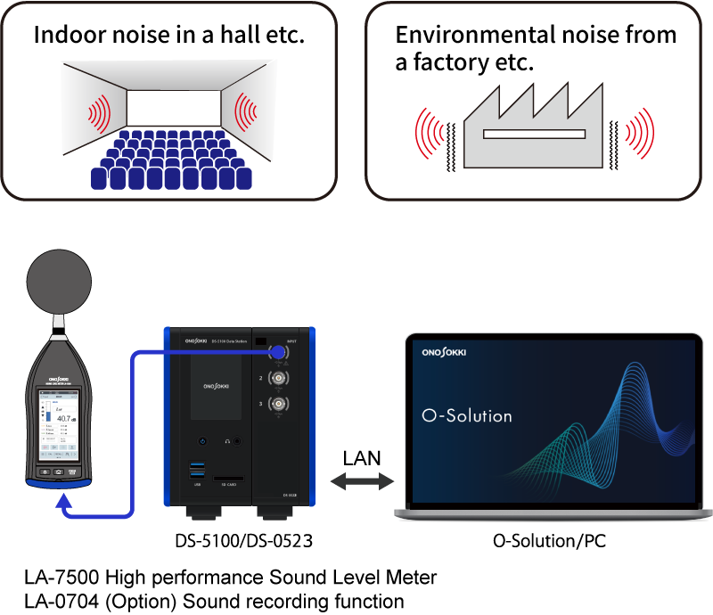 The DS-5000 O-Solution can analyze the AC signal through FFT analysis, 1/1・1/3 octave analysis and trend analysis of the specified frequency band. The output of A-weighted signal can be set by the LA-7500.