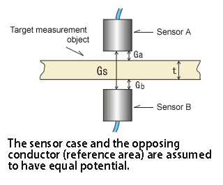 Arrange two sensors and the measurement object in parallel within the measurement range, and set the sensor gap value (Gs) in the CL-7100 Series. The measurement object is installed between sensors A or B, and the gap value (Ga, Gb) between each sensor and the measurement object is measured, and the thickness (t) can be obtained.