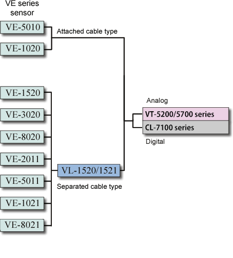 VE series are used in combination with the dedicated converter or electrostatic capacitance-type non-contact displacement meter, VT-5200/5700 series or CL-7100 series. Please be sure that an object can be measured and measurement accuracy depend on the converter or thickness meter. Refer to each product information page in detail.