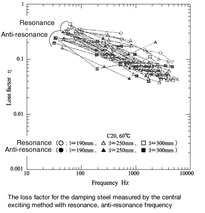 The following diagrams show the loss factor measurement results of the damping steel plate with different length of specimen and temperature. As shown, there are differences between resonance frequency and anti-resonance frequency.