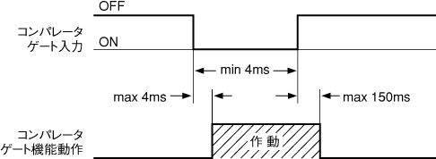 強制的に合否判定出力をoff にするときに使用します。コンパレーターゲート信号のパルス幅は、最小4ms以上必要です。コンパレーターゲート信号を入力してから機能が動作するまでの時間は、最大4msです。またコンパレーターゲート信号を解除してから機能が解除されるまでの時間は、最大150msです。