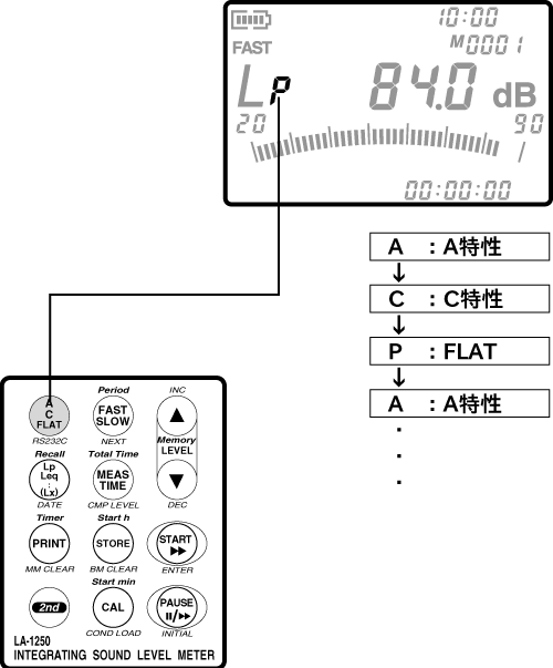 周波数補正特性はA/C/FLATの3種類あり、測定する目的に応じてパネルスイッチ[A/C/FLAT]により切り替えます。