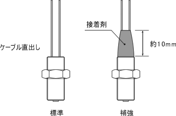 MP-992 はケーブル直出しのため接合部が他の MP シリーズと比較して弱く、使用状況によってはケーブルが MP-992 検出部本体から外れてしまう等の問題が発生することがあります。 ケーブルの補強が必要な場合は、 ご相談ください。下図のようにケーブル接合部を結着剤で補強した製品を製作することができます。補強手当は特注となりますので、価格・納期等の詳細に関しましては当社最寄りの営業所へお問い合わせください。