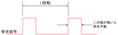 さらに反射光 OFF の時間(反射マークが無い部分)も最低同程度必要なので最大回転速度を表す式は ;
