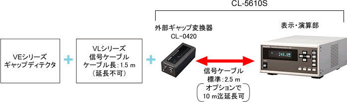 VE シリーズ ギャップディテクタと CL-5610 厚さ計間のケーブル長は 1.5 m となっており、性能を確保するため延長することはできません。1.5 m 以上離したい場合は、CL-5610S をご使用ください。CL-5610S では、外部アンプ(CL-0420)により、本体とセンサー間を最大 11.5 m まで離すことができます。