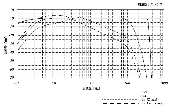 - Lva や LvF は、それぞれ周波数範囲 1 Hz ~ 80 Hz および 1 Hz ~ 315 Hz で振動加速度に比例した測定値を得ることができます。また、解析器を接続したり、オプションのリアルタイムオクターブ機能などを利用した周波数分析も可能です。
