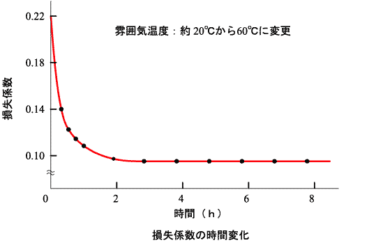 損失係数測定は大変デリケートな試験であり、注意深く制作した試験片を使用しても、損失係数や共振周波数がやや異なる場合が多々ある。これは、試験に使用する制振材料や基材の微妙な物性の違いや、試験片制作誤差等によると考えられる。このため、これらの誤差を極力避けるために、3本程度の試験片を使用して試験を行い、得られた損失係数や共振周波数の平均値を求める方法が有効となる。下図は、損失係数の時間変化を示す。図のように、温度を変えた直後は試験片全体が測定温度になっていないため、損失係数は安定しないことがわかる。この制振材料の場合は、約 2 時間で安定している。下図は、片持ち梁法により求めた試験片の損失係数と温度および損失係数と周波数の関係を示す。