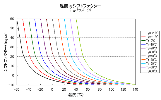 図2にシフトファクター(αT :移動係数)と WLF 式の関係を、図3に WLF 式の C1 = 17.44、C2 = 51.6 とし、Tg をパラメーターにした、温度対シフトファクター(log αT )のグラフを示す。