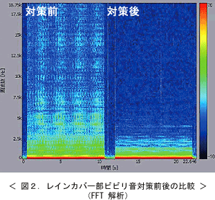 図3には同じ音源について、対策前後の変動音解析結果を示します。対策前は変動周波数(縦軸)が 50 Hz で、音の高さ(横軸)が 1 kHz、1.5 kHz、5 kHz 付近を交差する升目の変動量が大きくなっているのに対し、対策後は着目した升目の変動量が小さくなっていることがわかります。対策前後の変動量としては約 97 %減と大幅に減少しています。