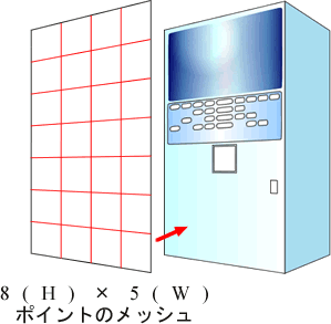 全体の騒音レベル(800 Hz までのオーバーオール)の音圧マップです。この音圧マップから、自販機前面左下部 が最も音圧レベルが高く、騒音源となっていることが認められます。