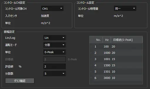 | 出力振幅コントロール | 「振幅制御ch」 任意に設定可能。 「制御する物理量」 振幅の設定は、Lin もしくは Log で設定可能。 振動(加速度、速度、変位)の場合は、微積分を行い、別の物理量で制御可能。 「運転モード」 振幅を一定もしくは分割で設定可能(分割数は30分割) 表示単位 (p-p、rms、0-p)、初期電圧値、出力最大電圧値、許容量を設定できる。 |