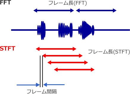 STFTを用いれば、同じフレーム長であっても、フレーム間隔および窓関数長をユーザが任意に設定できるため、