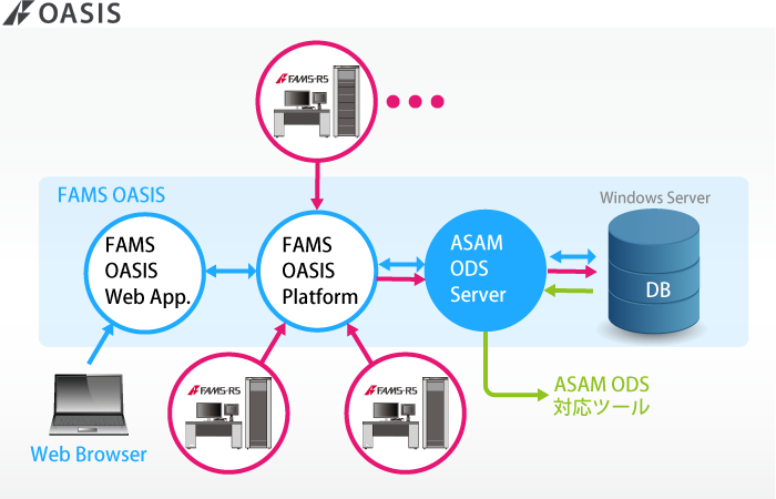 小野測器の自動車試験装置 FAMS-R5のデータをFAMS OASISに自動でアップロードでき、自動車試験のデータ管理を効率化します。
