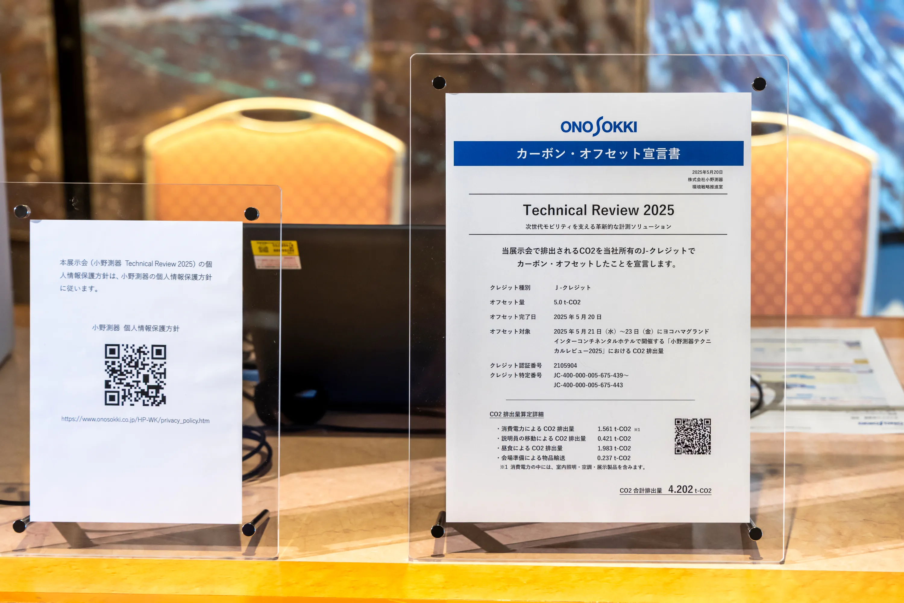 当社が2025年5月21日~5月23日に神奈川県横浜市のヨコハマ グランド インターコンチネンタル ホテルで主催した「小野測器テクニカルレビュー2025」において発生した以下のCO2排出量(会場設営に関わる物品輸送や会場での使用電力、当社社員の移動によるもの等)5 t分を当社所有のJ-クレジットでオフセットしました。ちなみに、2024年5月に実施した同イベントのCO2排出(4t分)カーボンオフセット済みです。